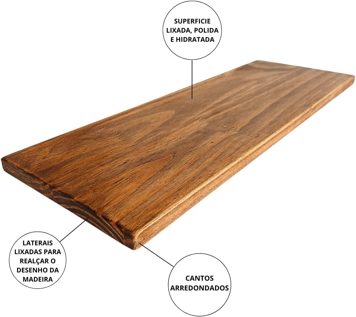 A Prateleira Industrial de Madeira Pinus 90x30cm foi desenvolvida para unir praticidade, resistência e um visual contemporâneo. Fabricada com madeira Pinus maciça de 30mm, ela recebe acabamento selado e envernizado, o que realça os veios naturais da madeira e protege contra umidade e desgastes do dia a dia.